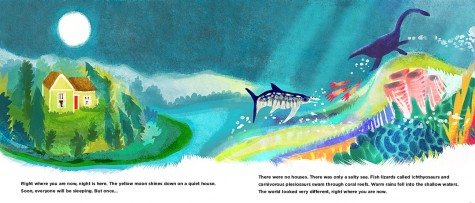 Where icy mountains stand, volcanos once spouted out lava. Where now a bluebird nests in an oak tree, megacerops lumbered through the woodlands. Tall skyscrapers shoot out of land that was once underwater. The book emphasizes how the earth is ever-changing and invites the reader to imagine what could come next.