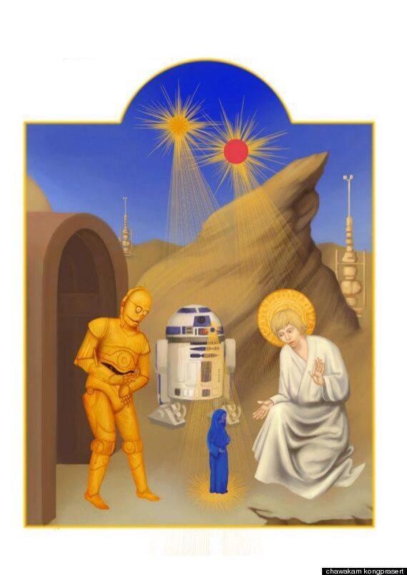 I’m not sure where it came from. Maybe it’s offensive. But I like it. Star Wars has always been my religion, my source of holy scripture, Check out the two suns in the background, and the little projected Virgin Mary “Leia” blasting out from the miracle that is R2-D2.