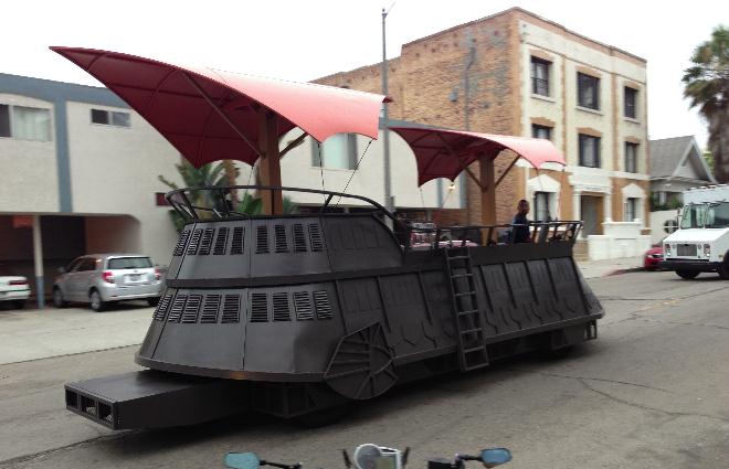 After checking in and being assigned our participant positions, we all got on a bus and rode to catch the relay. I was dropped off on a corner in Venice and waited for a few moments until Eliot and E.T. handed me the lightsaber. I ran along for my allotted quarter mile behind Jabba’s Sail Barge, swinging the lightsaber (for the benefit of the camera, of course). Too soon, though, it was over. I handed the lightsaber off to a nice lady in an R2D2 hoodie, then got on another bus with the other finished participants.