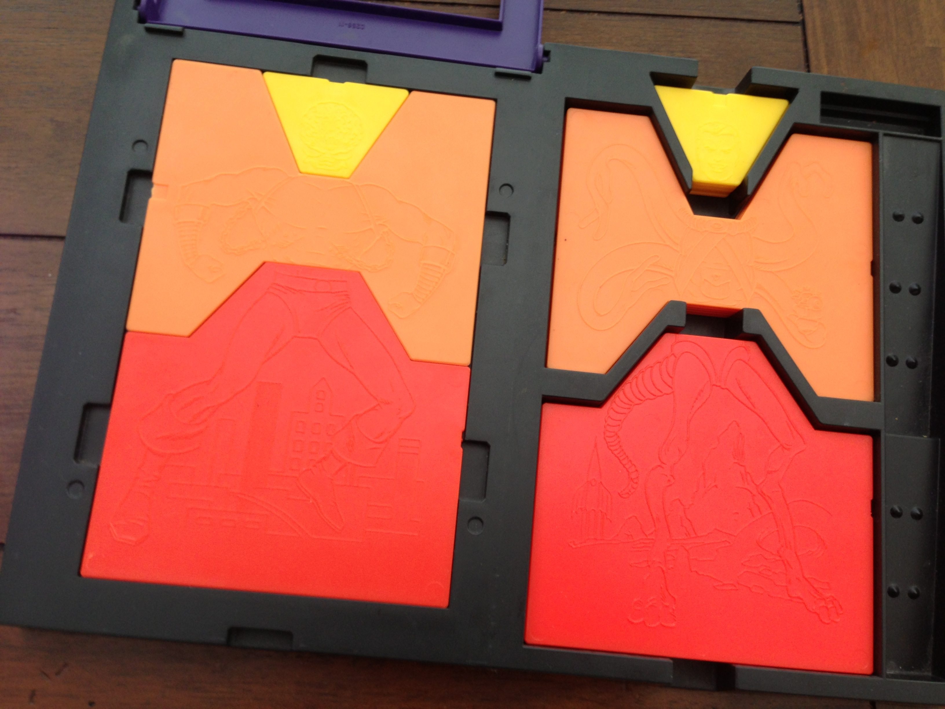 Lost holder and no box, my two boys don’t seem to care. Once I introduced them to how it works, off they went… it’s funny to watch my oldest consider each and every tile, trying to find the strangest combination. I remember doing the exact same thing, and I know I spent hours and hours creating various combinations. I wish a few of my 3D experiments had survived; as I got more into creating my monsters, I’d create two of each rubbing. One I would color in the monster and then cut out completely. The other I would color in just the monster with a black magic marker and then I’d color the background objects (such as the mad scientist collection of flasks and such behind the leg tile, for example). I’d then cut four or five thin strips of posterboard, fold them four times and make little squares, and then use these squares to glue the cut-out creation over the blackened shape. It created this three-dimensional figure that looked really cool from the front — I remember making some birthday cards for friends and gluing these 3D creations on front. I was such a geek.