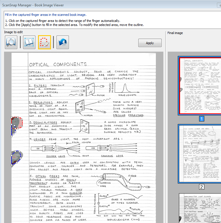 That’s right… the SV600 software allows you to remove fingers. It’s noticeable here because of the lined pages of the book, but through testing I’ve discovered that if you keep your fingers on the white portions of the left and right margins, the Remove Fingers button works very well. Below you can see how the software allows you to tweak the edges of the fingers by dragging small squares and surrounding the fingers.