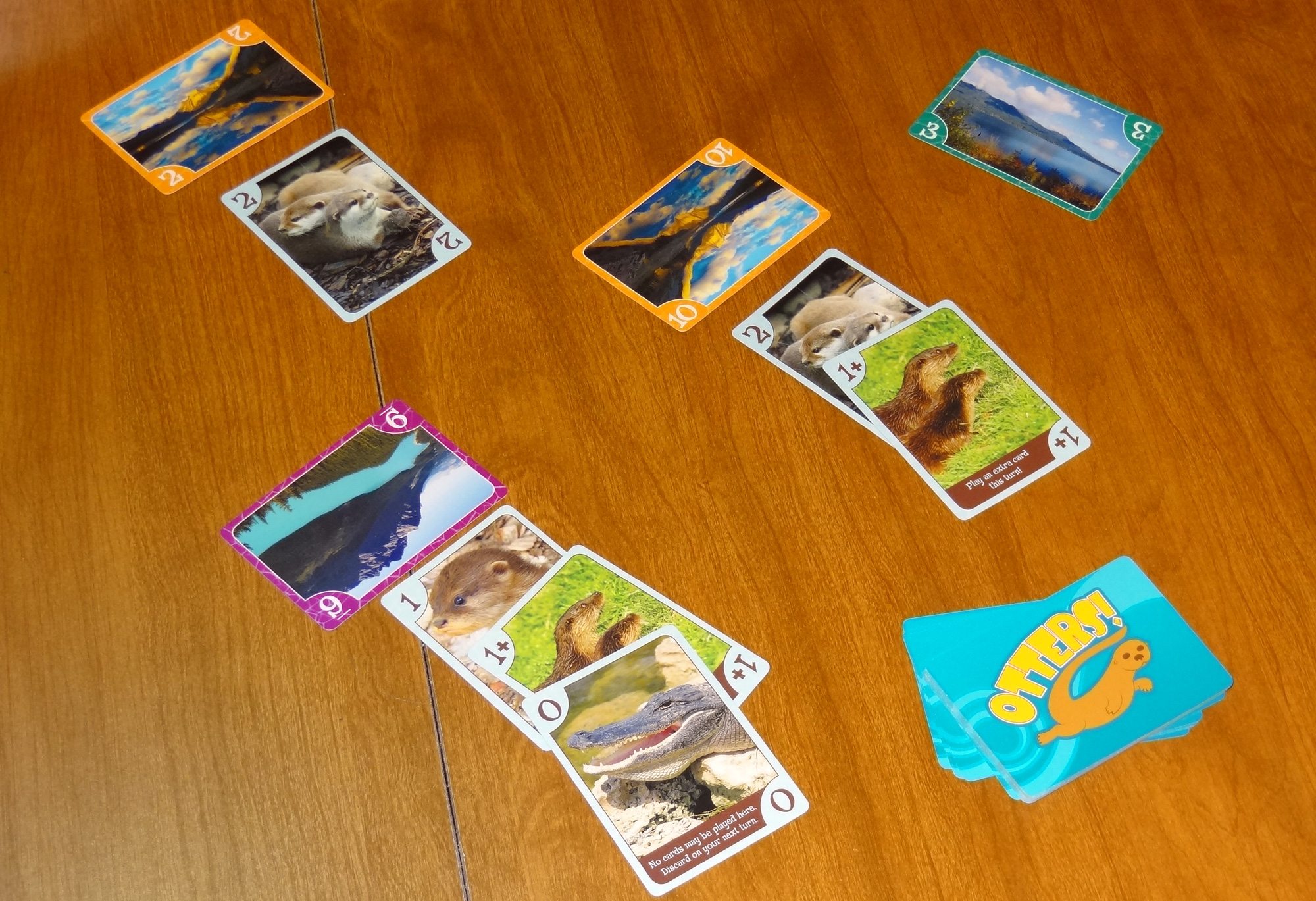 There are three different colored borders of backgrounds, three cards of each color, and they are numbered 2 through 10. The otter cards are numbered 1 to 3, and some of the 1 cards have additional effects on them.