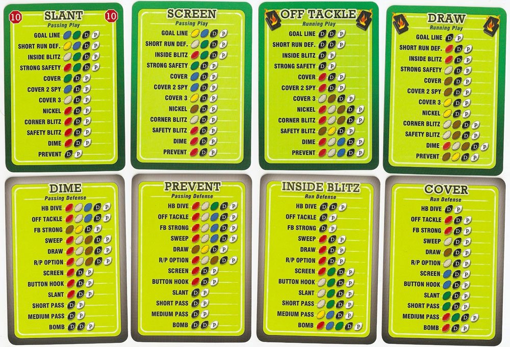 Each Offense card lists the 12 possible Defense plays, and vice versa. You match up the name of the play, and this indicates the dice which will be rolled. You always roll the white Play die, and then some combination of Yardage and Defense dice. When the defense type matches the offensive play, typically there will be fewer (or less powerful) Yardage dice rolled. In some cases, the defense will even get to roll the Defense die twice.
