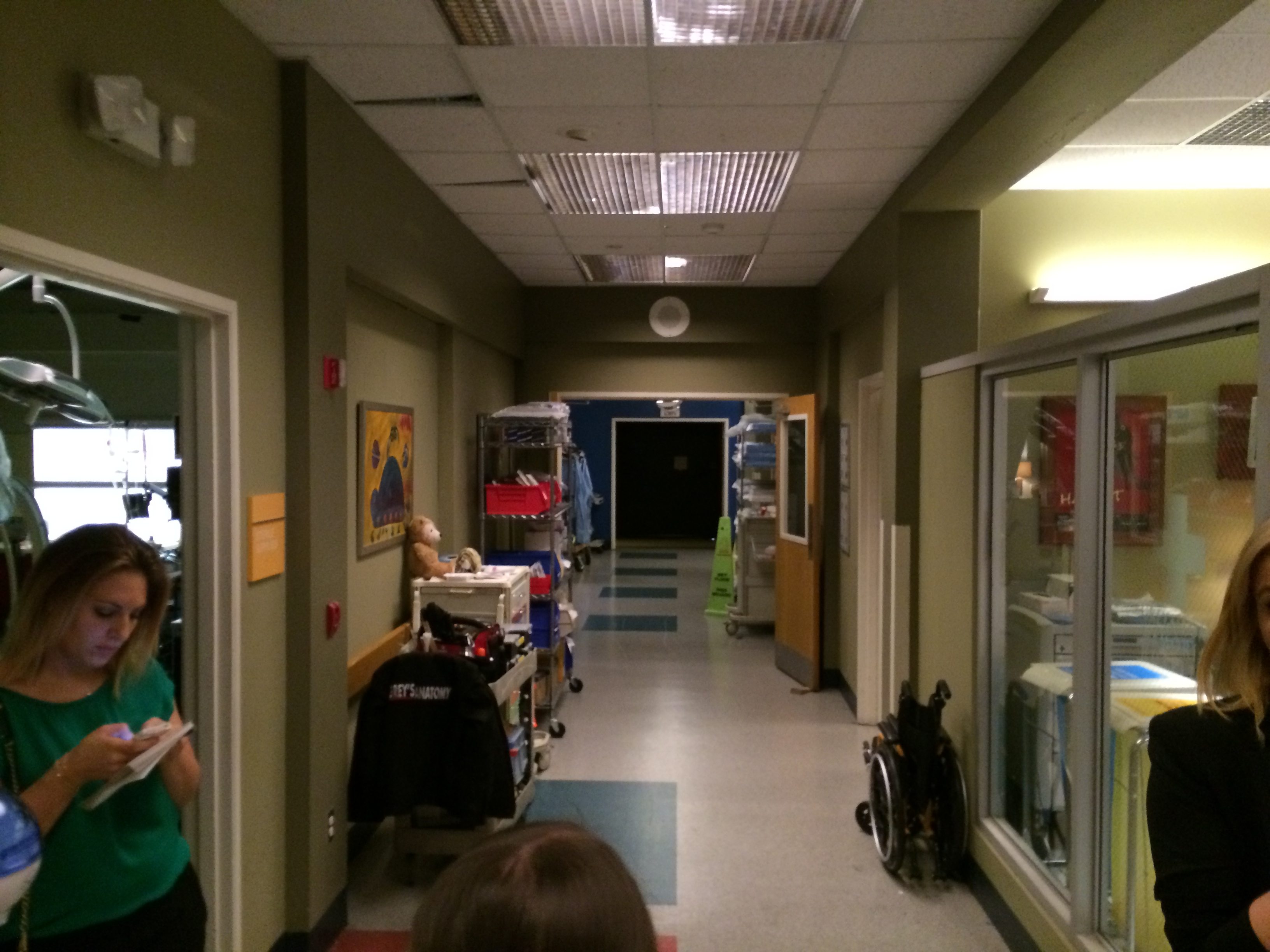 Visiting the set gave me a real appreciation for how hard the set designers work. We first visited the set of the home of two of the show’s characters, which looked for all the world like a place lived in by two very well-off people who hire someone to clean. But that wasn’t even that impressive when compared to the hospital set. I swear that the rooms that had proper ceilings (rooms on sets often don’t, if they’re going to be filmed in such a way that the ceiling won’t be seen on camera), you could bring in an unconscious person and leave him there, and when he awoke he would be completely convinced he was in a real hospital. Not that I’m advocating trying this, mind you. There were rooms and hallways and desks and such that anyone who’s ever been to a good-sized hospital will recognize immediately – consider how much stuff there is in an actual hospital room that you would only really notice if it weren’t there, and you’ll see what I mean. These people are really good at their jobs, and it shows.