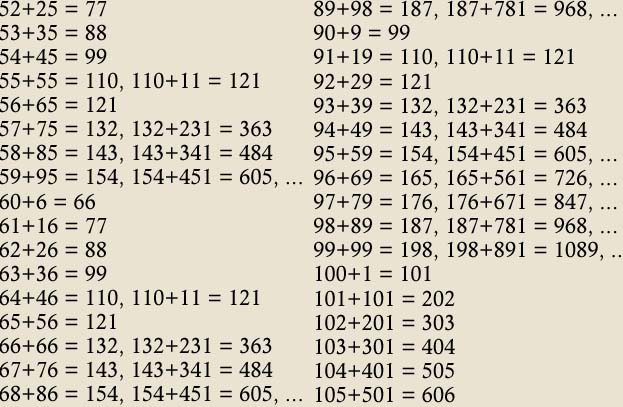 In any case, there are some interesting number of steps that numbers require to be proven as “non-Lychrel.” For example, the numbers 60, 61, 62, and 63 all require just one iteration to become palindromes, and both 91 and 92 resolve to the same palindrome (91+19 = 110, 110+11 = 121 and 92+29 = 121.)