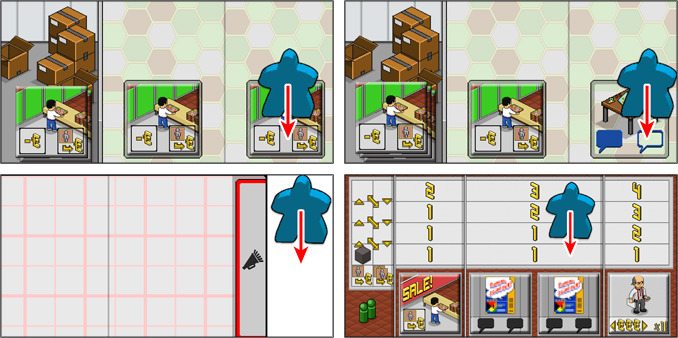 The four tables can be used as demo tables, generating buzz for your booth (represented by the little speech bubbles), which can let you poach visitors from neighboring booths. Or you can sell games—in which case you put the selling tiles on the table, covering up the “demo table” icon. It costs $1 for each table you’re selling at.