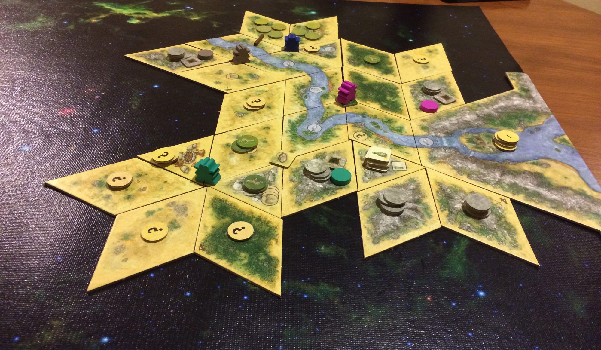 It’s also good for games with modular boards, even if they’re not tile-laying games. Settlers of Catan, for instance, would stay in place on a GripMat. We played a game of Damage Report, though I found that in some scenarios the ship is a little too large for my mat, which is about 23″ x 31″. Even though the ship did overlap the edges of the mat, the mat did a good job of holding things in place. The GripMats do come in larger sizes, including a 24″ x 42″ long rectangle or the 36″ x 36″ square, but those are getting a bit large for my round tables.