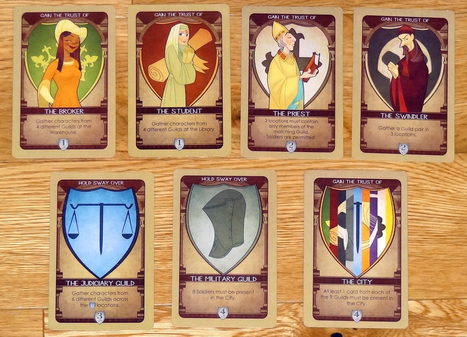 So far in my games it’s been pretty easy to tell at least roughly what somebody is going for, because they’re moving cards to a specific location. But you can’t necessarily tell if somebody is trying to gain the trust of the Butcher or Baker, or just hold sway over the Artisan Guild as a whole. But then since there are other missions, like the “8 Soldiers Present in the City,” it could be that somebody is just moving things around to fool you. Because of the way some Guild and Character missions can overlap, it could also be the case that fulfilling your objective helps somebody else get closer to theirs as well, which can make for interesting dynamics.