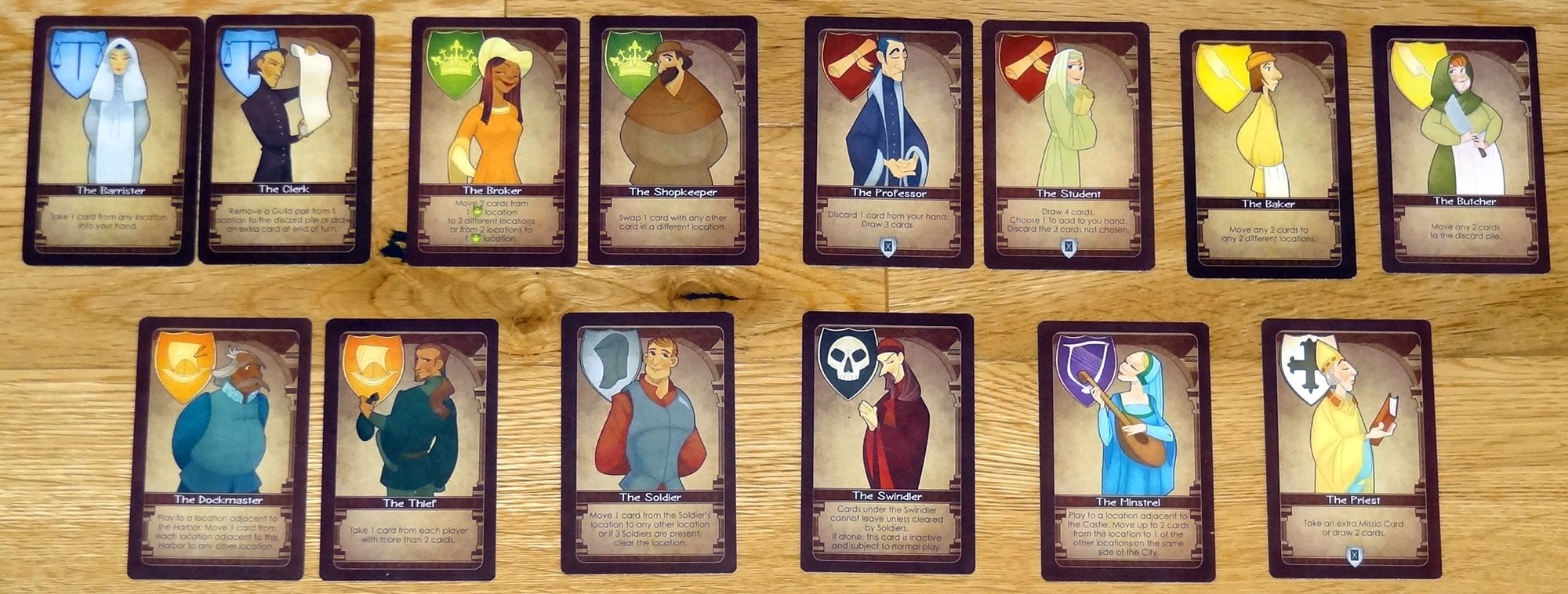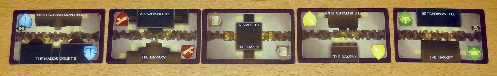 To set up, you lay out the five locations in order to make up the City: Judiciary, Academic, Tavern, Artisan, and Commerce. Each card except the Tavern has two different locations on it, one on each side. In addition, the Judiciary has a little sign indicating the Castle, and the Commerce has a sign indicating the Harbor—these are two spots that may be referred to by other cards.