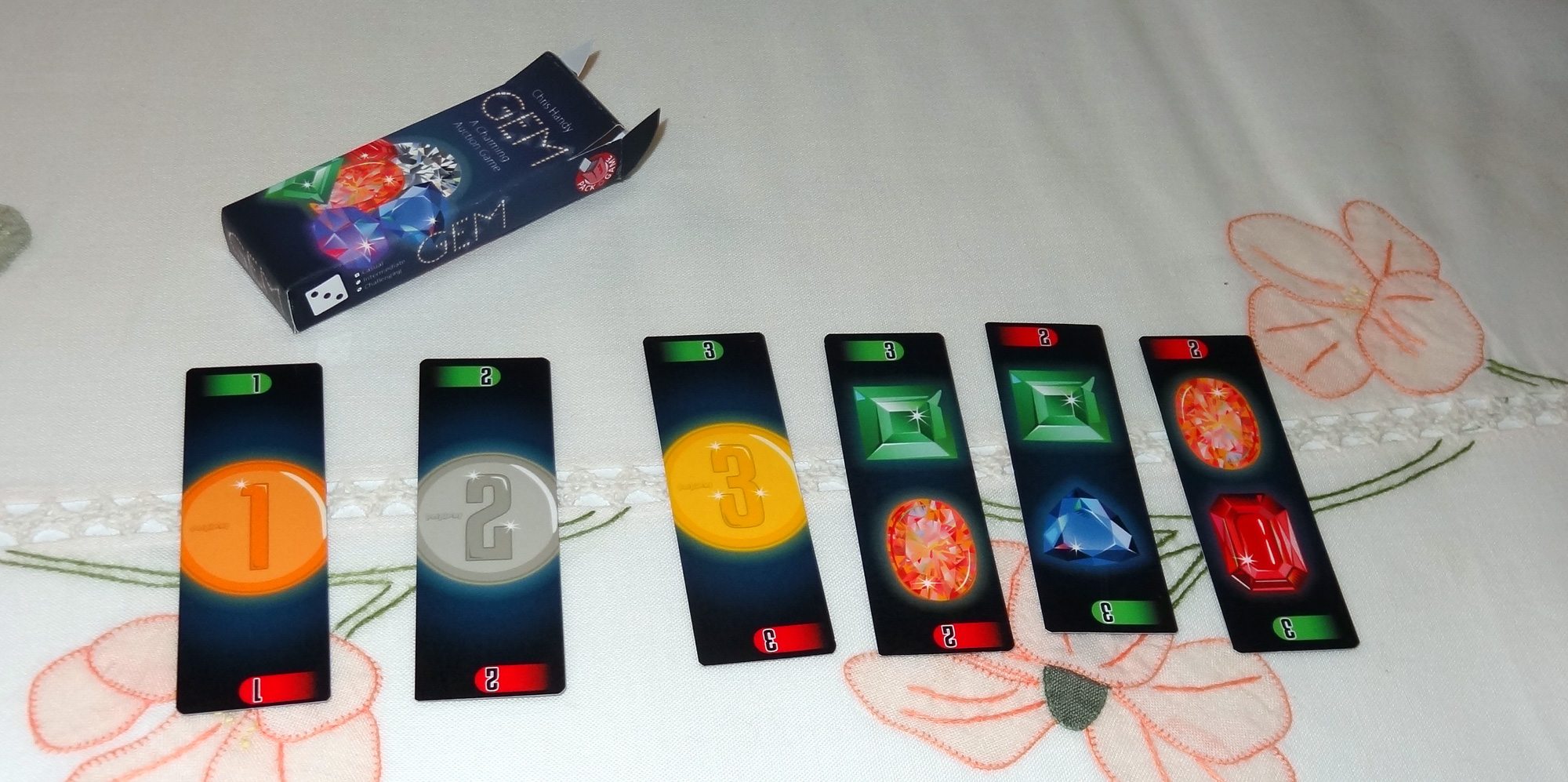 GEM is the one that my kids kept wanting to try, but it’s one of the more difficult games. It’s a bidding game where you try to get the most valuable gems (and the most gems of a type). What’s interesting is the way that you can leverage the value of gems you own in order to bid on others, and then pay to buy them back. Tricky, but definitely worth another try with some more experienced players, I think.