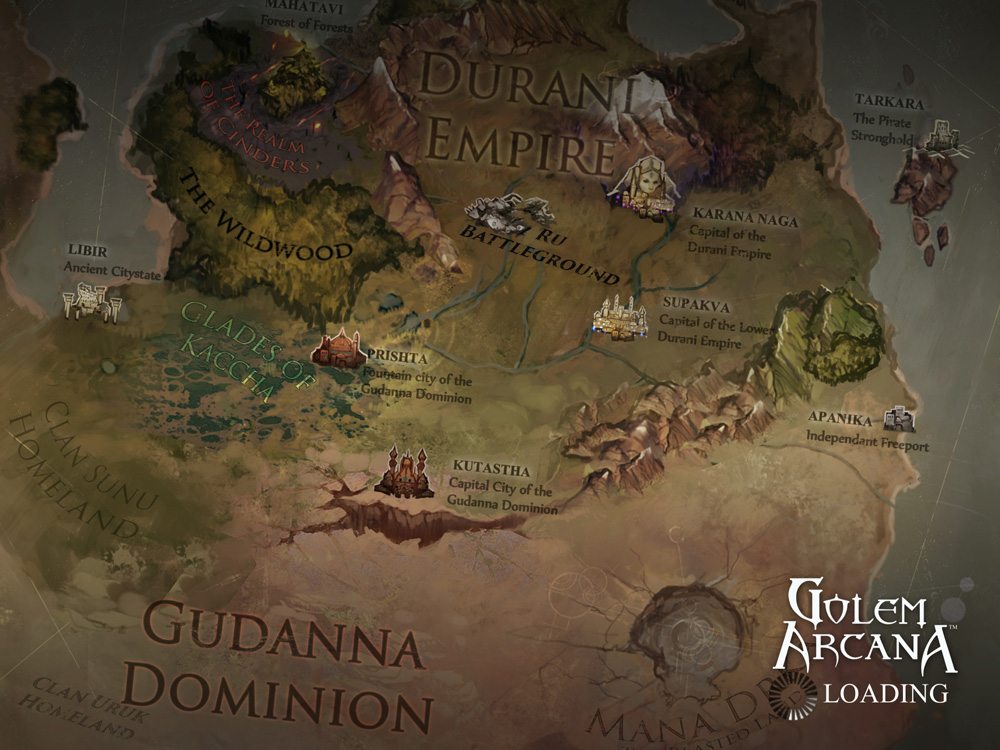 The mythology surrounding the game is pretty rich and there is ongoing fiction surrounding the land and the conflicts between its factions. In the land of Eretsu, the Great Kahn has died and his heirs are now vying for control of the land that has remained unchanged for nearly a thousand years. Monstrous Golems cross the hard-baked wastelands and misty forests to do combat at the Ru Battleground. These titans, crafted from bone, branch, blood, and stone, rely on guidance from Knights who control the beasts and Ancient Ones who bless the armies and curse their enemies.