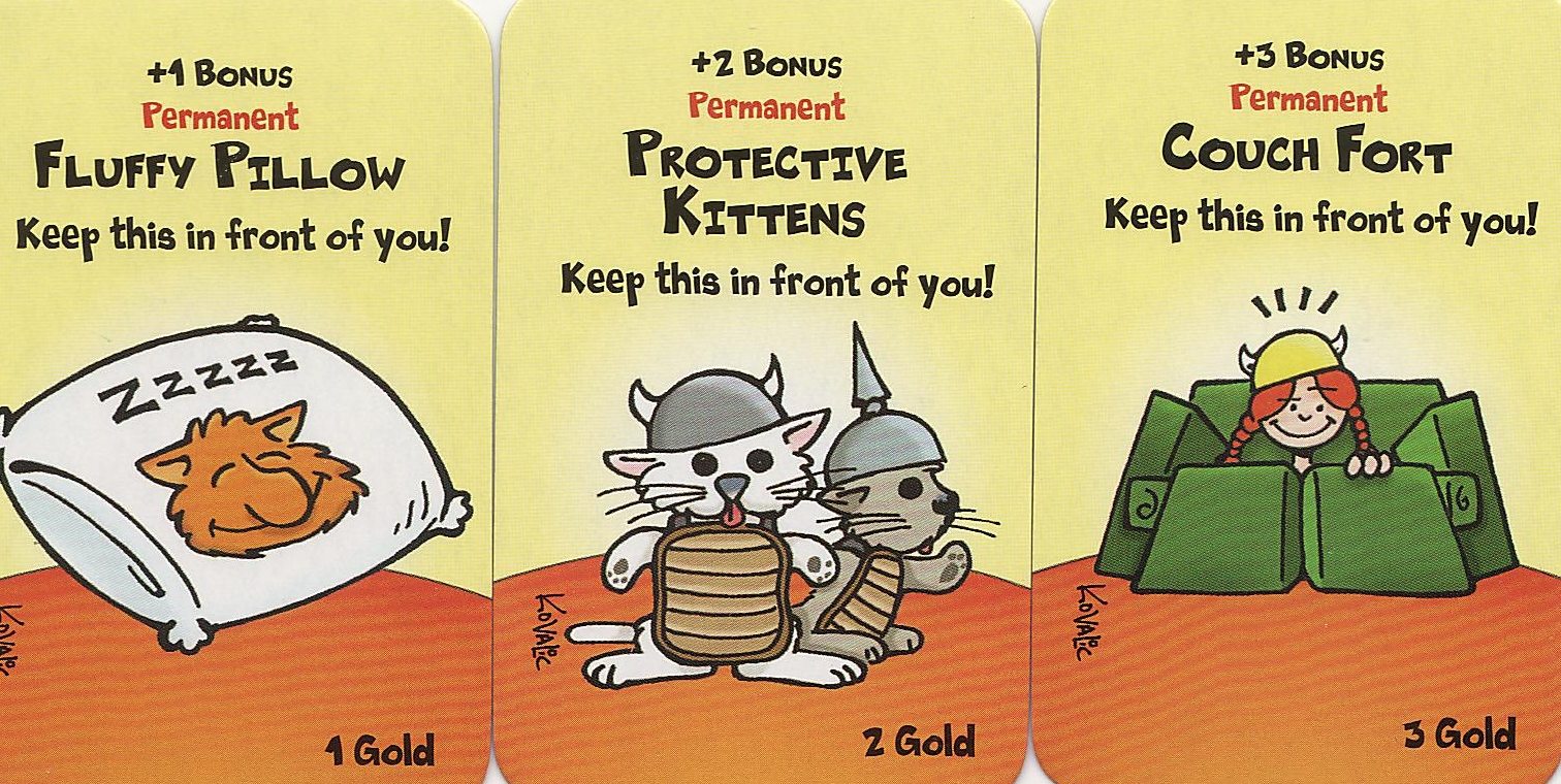 Treasures come in two kinds: permanent and one-time. One-time Treasures are discarded after use, and most either add to your power or allow you to help out your die roll with another die, or a re-roll. Permanent treasures are played on the table in front of you, and their bonuses remain active until you lose them or swap them out. You can only have two permanent treasures at a time though, so if you’ve got two on the table and want to upgrade, you’ll have to discard one that you’re using. (Each Treasure has a Gold value printed in the lower right corner as well. Pay attention to these.)
