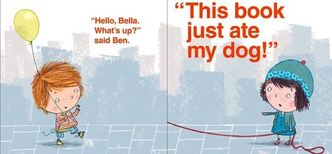 The main character here is Bella. She was innocently walking her dog across the page when the book ate her dog (it disappears into the crease). Her friend Ben walks by and is eaten too, then an ambulance, and finally Bella! It’s up to the reader to sort it all out and save the day. Though, things aren’t sorted out perfectly in the end…
