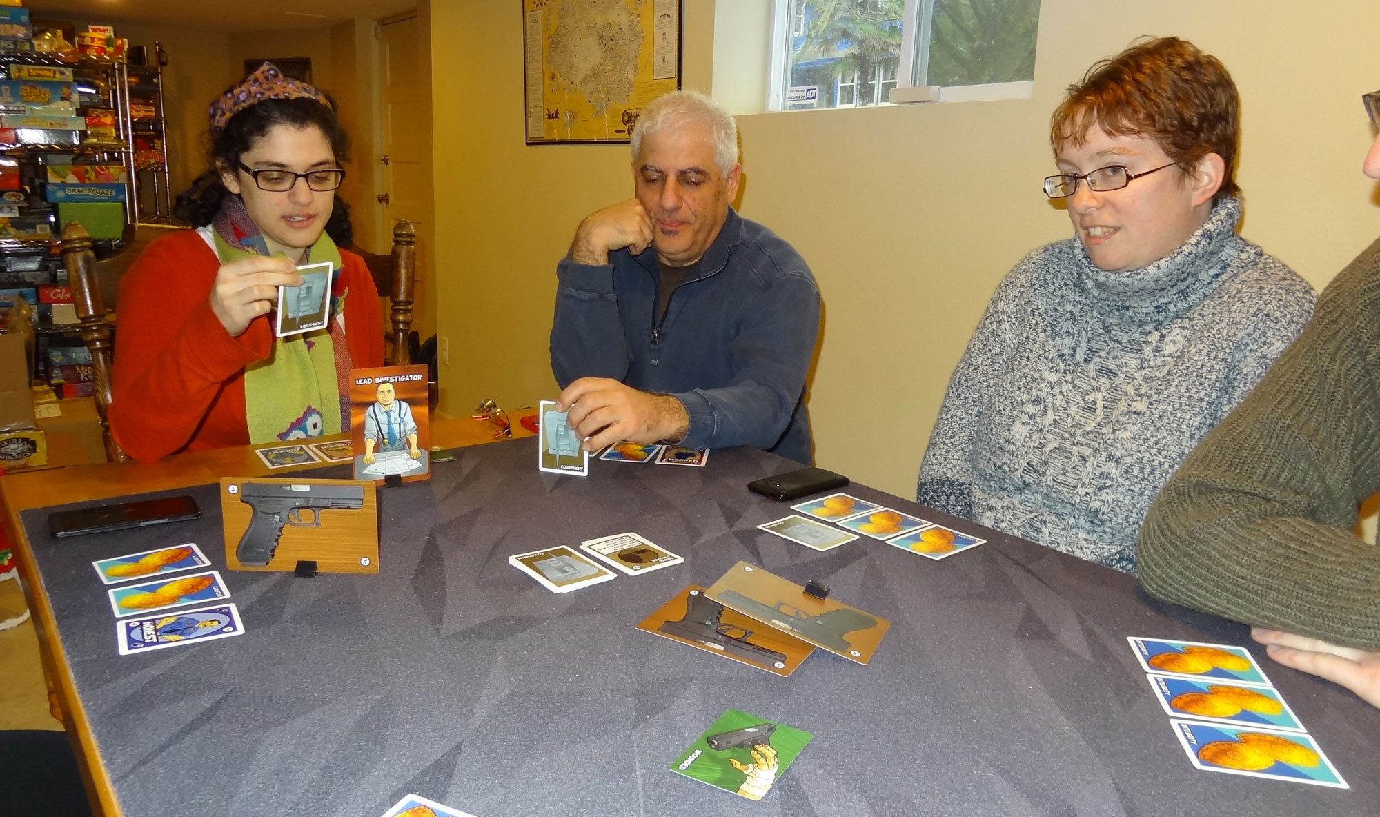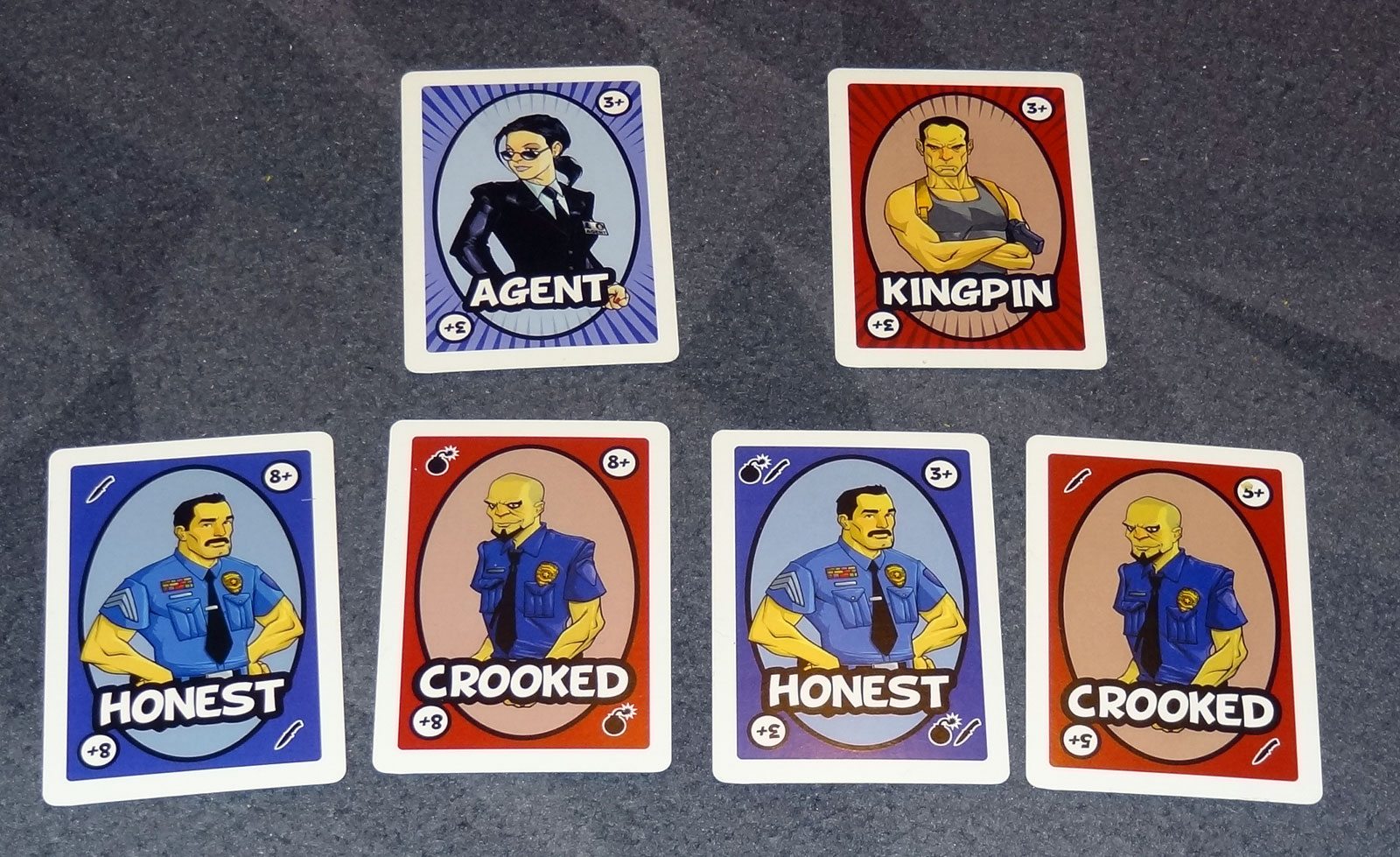 My only critique was something that I didn’t know about when I wrote my initial review–the artwork for the integrity cards was replaced from what I’d seen. The prototype used simple icons, and the final game included full-color illustrations of four archetypal cops on the Agent, Kingpin, Honest, and Crooked cards. I was a bit disappointed that they looked stereotypically “good” and “bad,” because the whole point of the game is that you can’t tell who’s good or bad just by their appearance. Still, it doesn’t really detract from the game, and the artwork is well-done–I just didn’t think it served the theme of the game, and I imagine many gamers will probably prefer the artwork to the icons anyway.