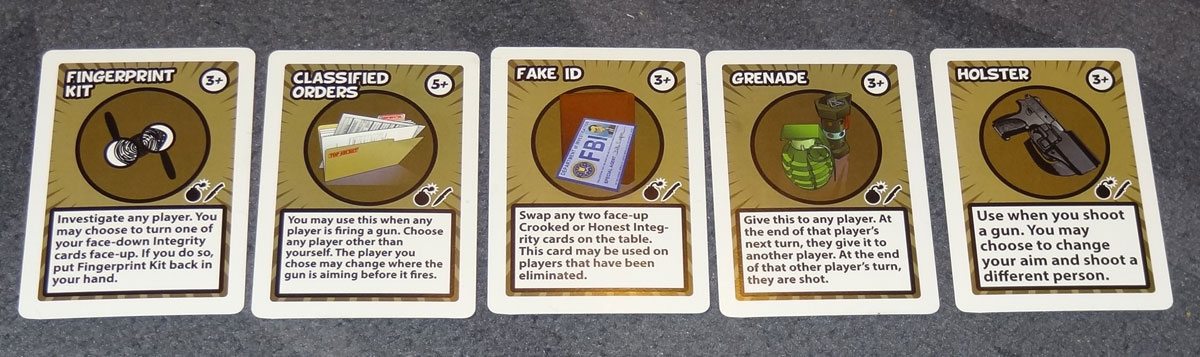 The rules for the base game are here, or you can read the overview from my review of the base game. I’ll explain the differences that the expansion adds, but here’s a very short summary: Each player will have three Integrity cards (most say “Honest” or “Crooked”) that determines their loyalty. There’s also one Agent and one Kingpin–these are the leaders of the honest and crooked cops. The goal is to find and eliminate the leader of the opposing faction through investigating, using equipment cards, and shooting them with guns.