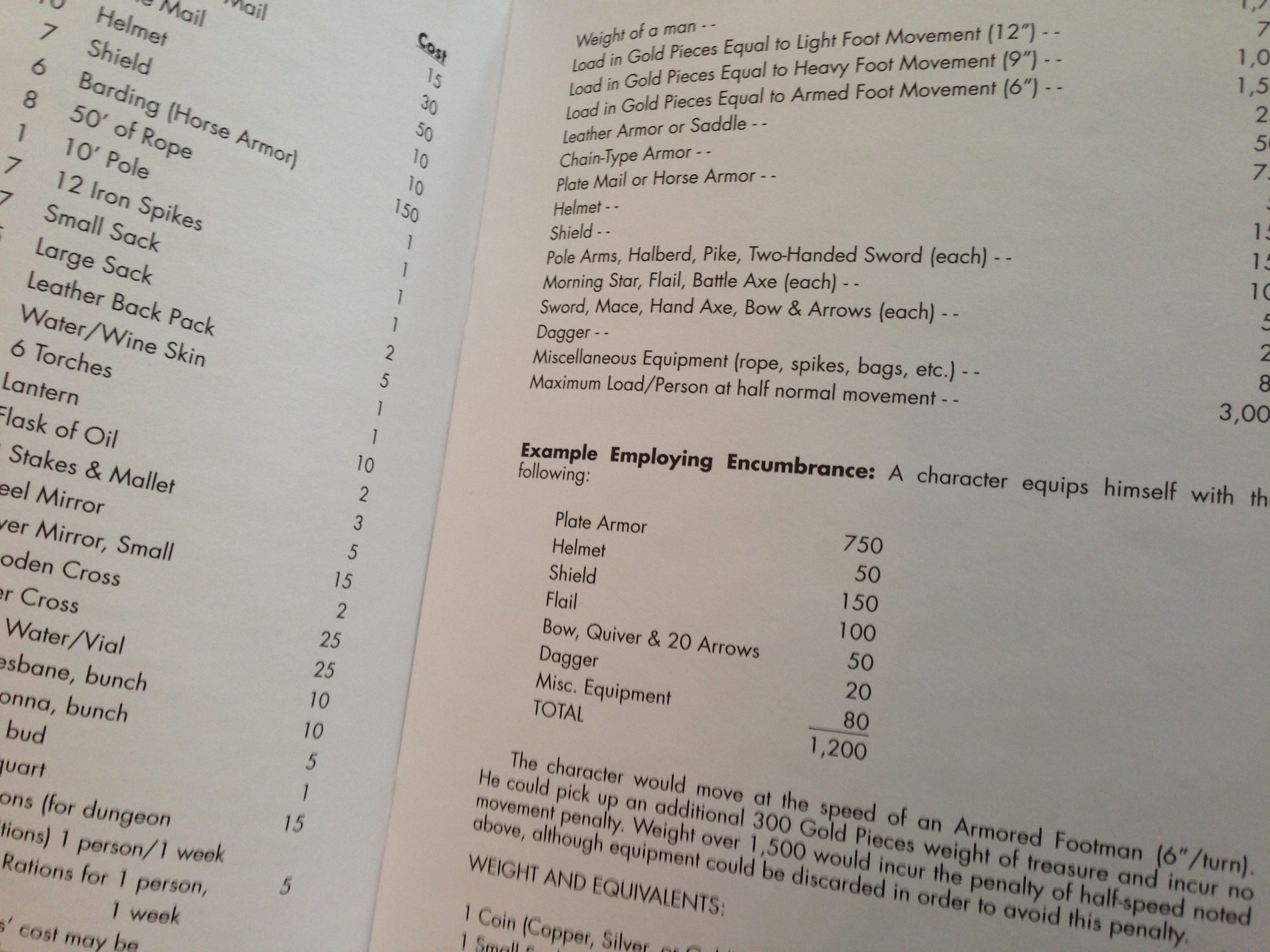I’m going to close this comparison by jumping back to the supplies/weapons/armor listing in OD&D on pages 14-15. Not only did supplies have a gold piece cost, but the OD&D rules also had an encumbrance value for these items that tended to affect movement speed only. Prices don’t have a large fluctuation between 1974 and 2014, apparently: