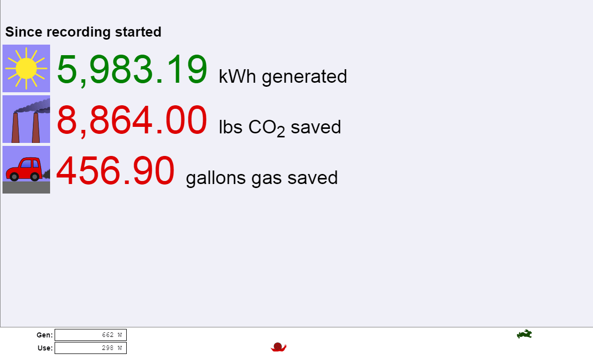 The eGauge also has what are called kiosk views. This one, the Bunny Kiosk, is intended to be something to show kids and start educating them on power consumption, solar generation, CO2, and gasoline usage. There is a cute little hare and tortoise that move across the bottom at a speed relative to how much power is being generated and used in real-time. It also gives you a nice easy to digest view of how much power your system has generated (5,983 kWh since installation), how many pounds of CO2 that translates to (8,864), and the equivalent gallons of gas that CO2 has offset (457). My son Owen is a little too young for these concepts but this will definitely be our first stop when he is a little older and I start teaching him about our solar system.