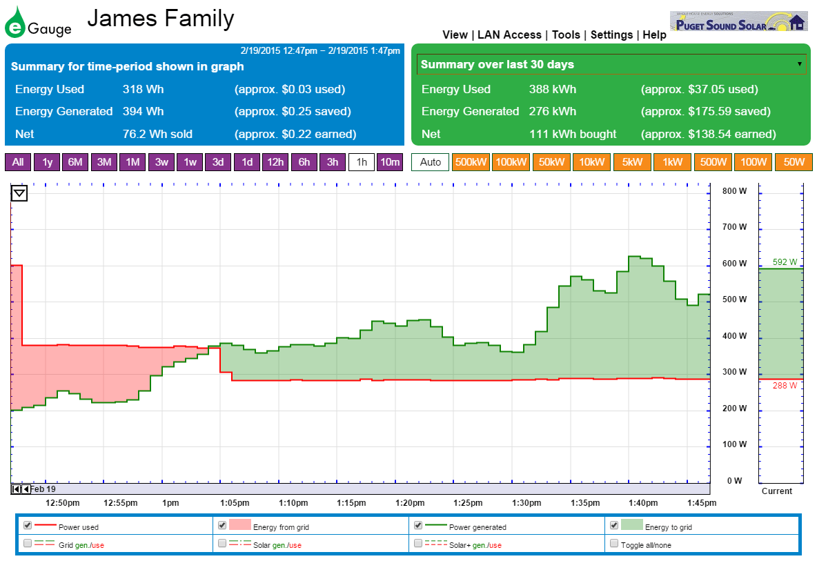 The best part about this view is that it is truly REAL-TIME. Flip a light switch on and off and you will see exactly how much THAT light uses. We’ve used this more than a few times to find pesky power vampires in our house. A couple of months ago it even helped alert us to a problem with our HVAC system that had almost doubled our energy usage. Pre-solar system and without this tool, we wouldn’t have noticed that we had been wasting that much electricity for 2 months or more!