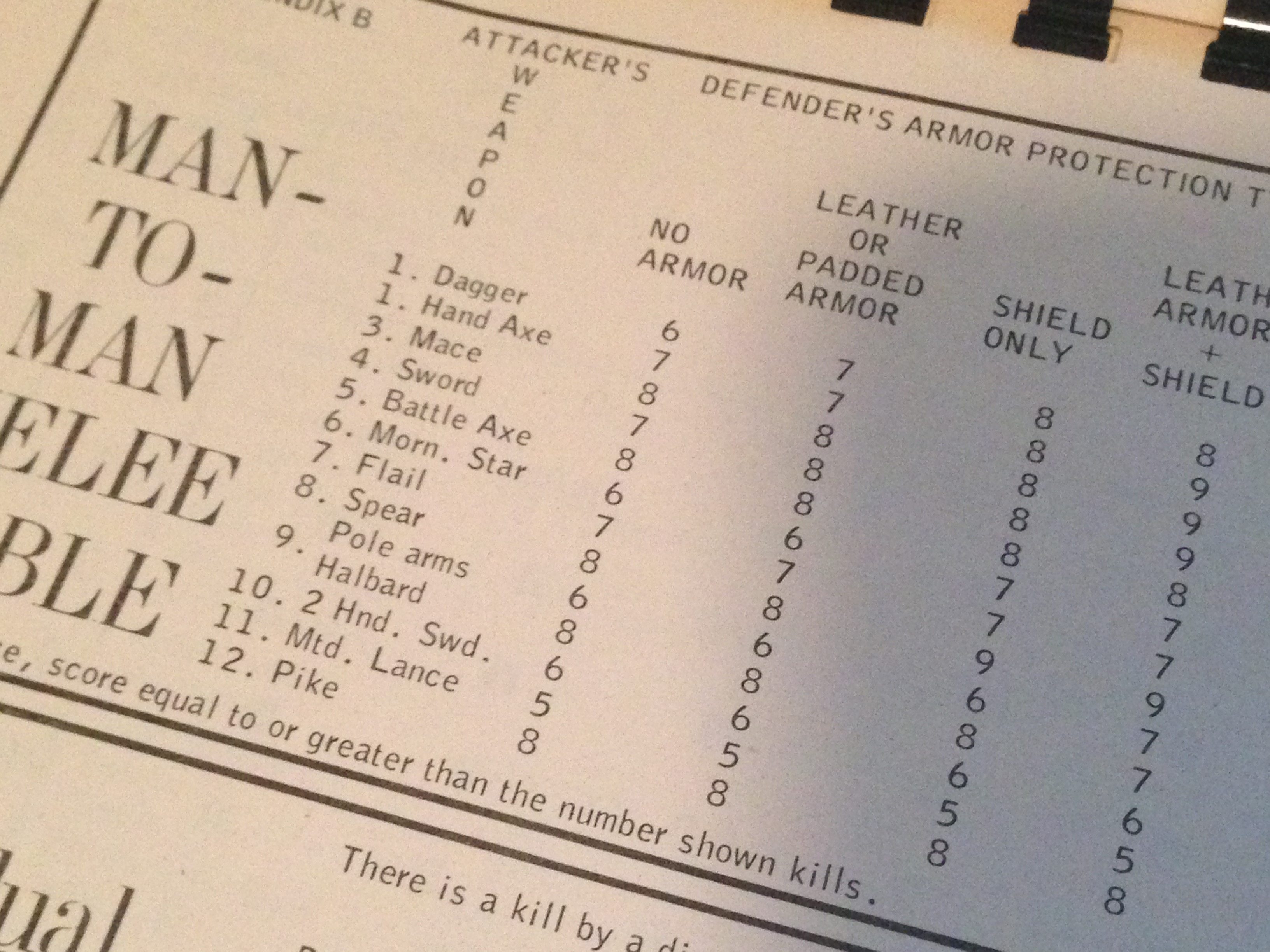 Note: It’s also interesting that the number of attacks per turn was also defined by the class of weapon used. If a class difference between attacker and defender was 4, the defender would get two strikes per round. A difference of 8 would allow the defender to strike three times per round!
