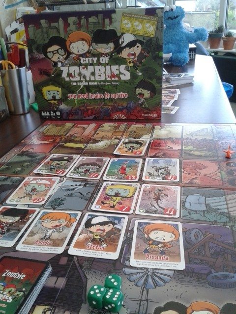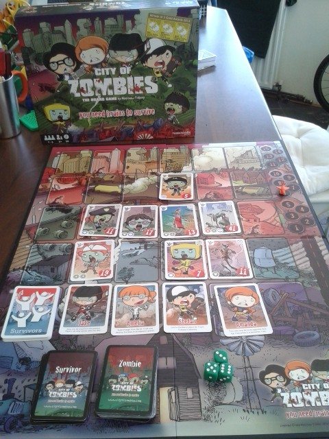 The icing on the cake, or perhaps the fluid on the brain, are the game’s production values. The zombie artwork is excellent. There are two types – cartoon and pen and ink. The type D cards, more generally used for older children, have more graphic depictions of zombies on them, but I don’t think they’ll give children nightmares. If you are unsure, there are lots of examples of the art work on the City of Zombies website. The card stock is good, the board is well made and the dice are high quality (making that satisfying clack when you shake them in your hand). It’s a great product to look at as well as play.