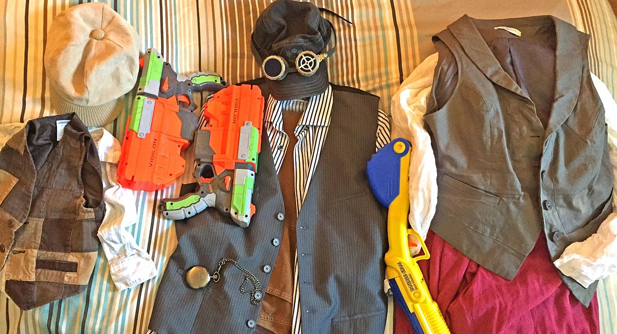 With our father and son cosplay all squared away, and only two weeks left until the con, we brainstormed some more and decided to take our first stab at doing Steampunk cosplay. With a scavenge through our closets and a quick trip to our local Goodwill store, we were able to get all of our clothing and a few Nerf guns to use as the base for our cosplay.