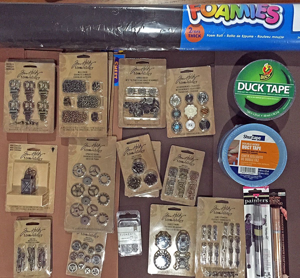 Armed with The Steampunk Adventurer’s Guide: Contraptions, Creations, and Curiosities Anyone Can Make written by Thomas Willeford and art by Phil Foglio of Girl Genius fame, we set about making a list of things we wanted to make to go with our cosplay. We went onto the Jo-Ann website to look at their foam and scrapbook supplies (as suggested by the book). To our great surprise and luck, all of the scrapbook accessories were 50% off! We went through everything they had available (and there is a lot) and narrowed it down to just the things we thought we’d be able to implement in the short time we had left. We placed our order and waited for our goodies to arrive.