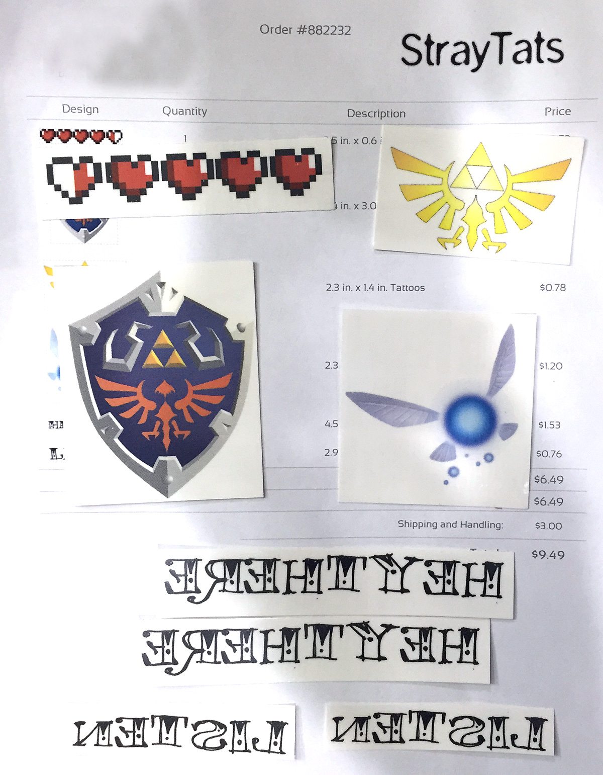 The Navi cosplay was still incomplete and I realized I was missing one crucial element–Navi’s annoying catch phrases! I thought long and hard about how I could project those sayings without breaking the “hipster” element of the cosplay and then it hit me–tattoos! I went to Stray Tats and worked up some fake tattoos–a Navi and a Hyrule Crest tattoo for the backs of my hands, Link’s shield for one forearm, a health meter for the other forearm, and, the final touch, knuckle tattoos that spell out “HEY THERE! LISTEN.”