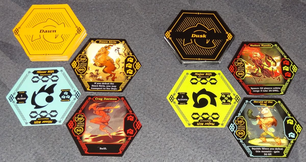 I won’t get into all the details here, but as you move about the board, you’ll encounter various creatures to fight, rifts to seal, items to pick up, and various other encounters. Most of these will have some sort of reward to get energy cubes, which you place into your storage. When you return to the Dojo, you may use your stored energy to achieve an attunement–you have to fill an entire row with the matching color, though you can fill rows in any order. Each attunement will give you new abilities–power cards, additional storage space, or even more actions.