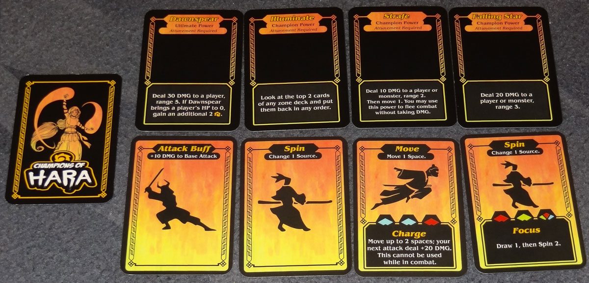 I appreciate that there isn’t player elimination–you just respawn, and you lose some progress. But it does feel somewhat funny that you’re all champions trying to save Hara … and beating each other up because each of you wants to be the one champion who saves the world. Thematically it’s a little funny, but I suppose not unlike many other games. One of the stretch goals is a cooperative variant, and that sounds like it could also be a very fun way to play the game.