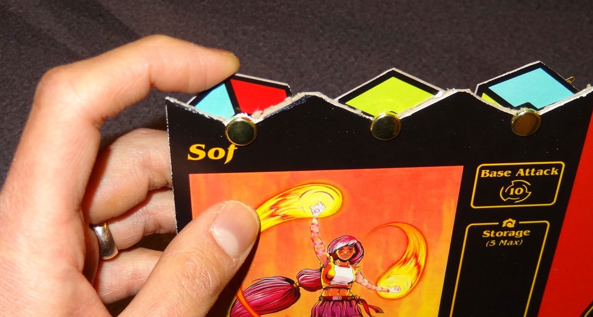 The champion boards have various information on them: a character portrait is prominently displayed on the left side, with trackers for actions and health below it. In the center are some spaces for storing energy cubes you acquire. On the right side of the board are many spaces for energy cubes–these are used for “attunements” that unlock additional abilities. Finally, on the top of the board above the portrait are three “energy alignment” spinners; each one can be turned to show red, green, or blue. The prototype version just uses brads for these but I imagine the final version will use plastic plugs or something.