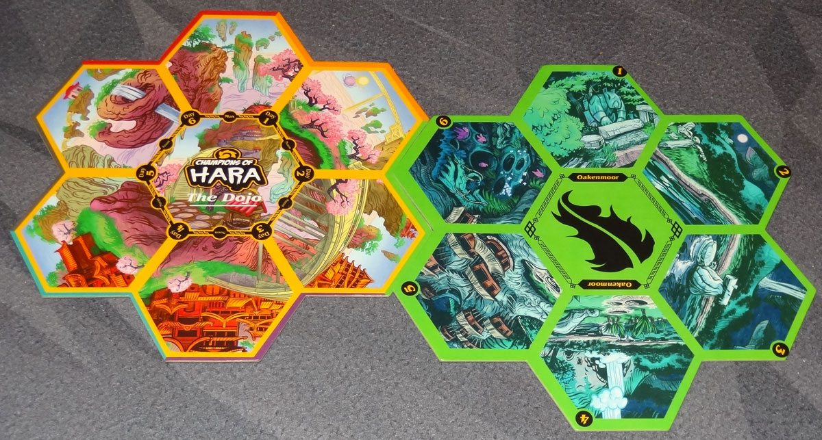 The board is set up with the Dojo tile in the center, and the six worlds placed next to it matching the colors on the edges. Each world’s deck is shuffled and placed on the center of the board; the Dawn and Dusk decks are shuffled separately and placed next to the board.