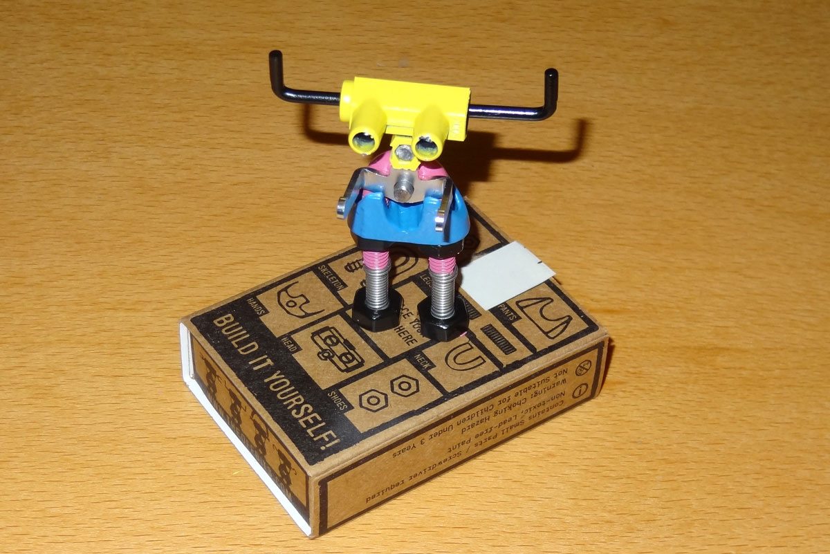 The kit comes in a small slider box, a little smaller than a deck of cards. You get a mini-screwdriver and instructions along with all the parts. There’s also a magnet with some double-stick tape so that you can stand the completed robot on the box when you’re done.