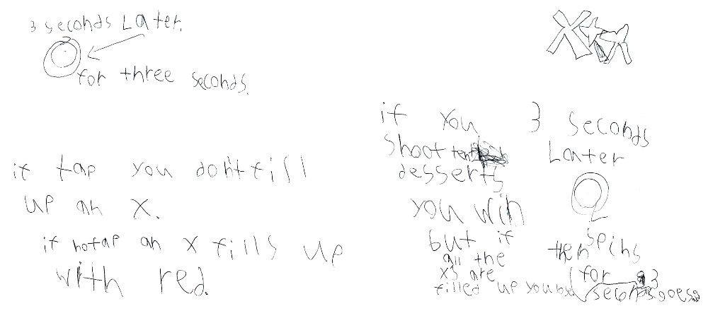 text() function. Photo: Michael LeSauvageAfter a couple of days, my son presented me with a design for a game he wanted to program called Dessert Clicker. He had laid out the core of the game: a dessert appears on the screen and spins. If you tap it before three seconds are up, you score a point. Ten points and you win, three misses and you lose. I wasn’t certain we could make it in Bitsbox, but it turned not just to be possible, but easier than I thought, and you can see the code and try the game on the Bitsbox site. (Note: to see the code you’ll need to be at a desktop PC and widen your browser.)