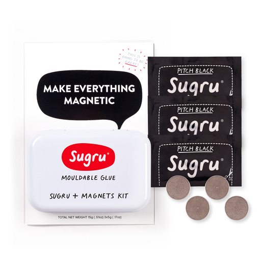 Sugru comes in white, black, and a slew of colors. If the many colors still aren’t to your liking, blend them together, as you would modeling clay. Sugru also comes in a Sugru + Magnets Kit, which contains three packets of black Sugru, four neodymium magnets, an idea and tip booklet, and a Sugru tin. Use this to make your projects even more versatile, allowing you to stick your cured Sugru blobs to anything a magnet will stick to.