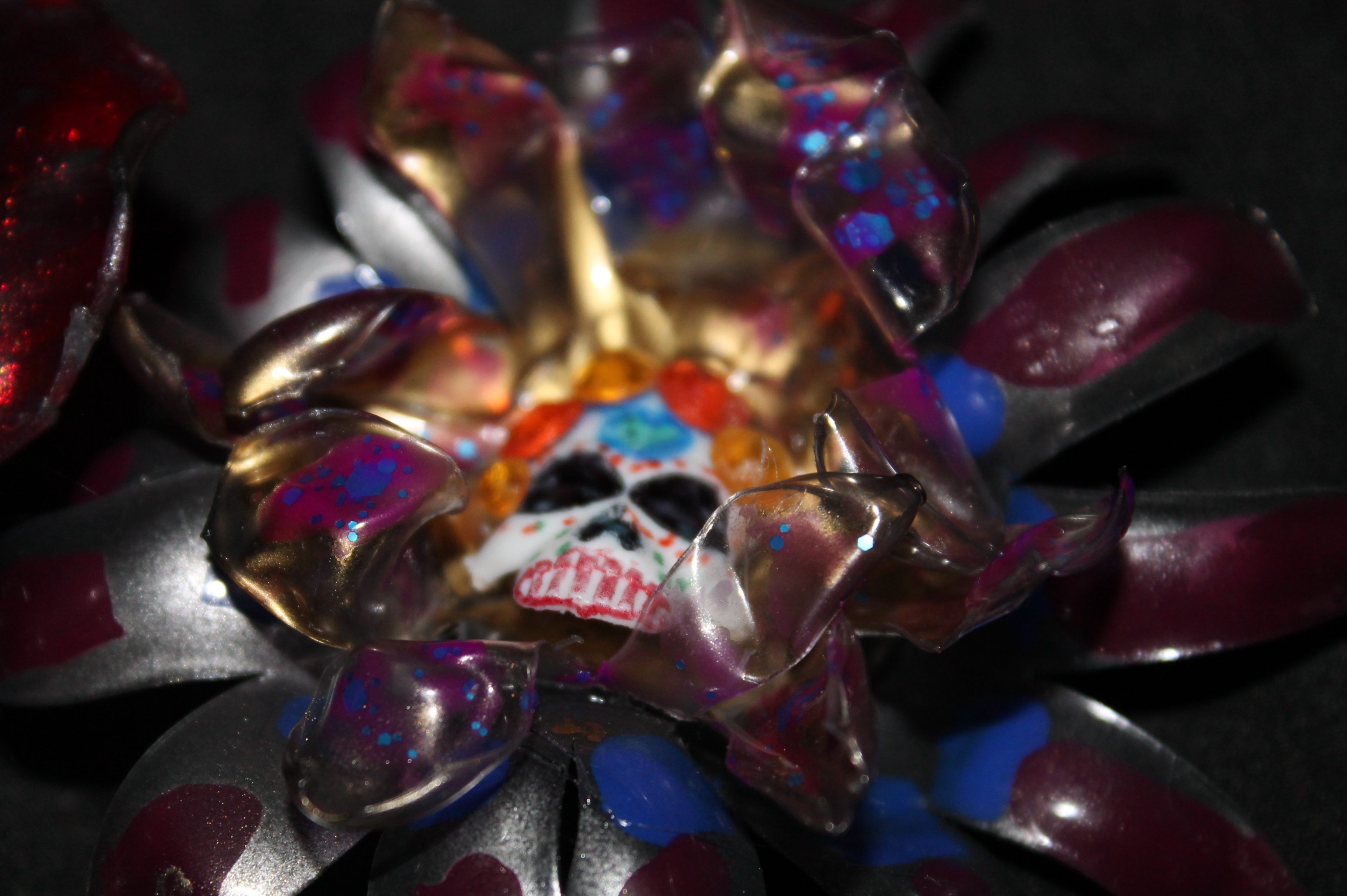 Paint or decorate a cheap spider or skull ring left over from those endless Halloween carnivals to look a little steampunk or like a DÃa de los Muertos calavera (skull). Clip the flimsy back off the ring, and glue it to the center of the flower. Add other embellishments if you want.