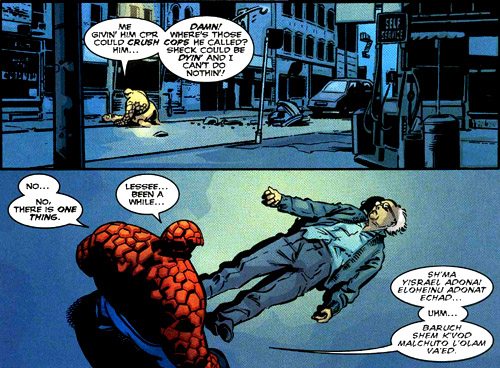 Aside from The Thing having never shown an inkling of interest in religion in past stories and then suddenly knowing the Shema (the basic central tenet of Jewish Faith), there had been a story in the 1994 Marvel Holiday Special where Ben Grimm saves a Jewish kid on Chanukah (Hanukkah, to some), and has no idea whatsoever what Chanukah is–which is pretty tricky if you’re a New York native of any race, but basically impossible if you’re Jewish. Shema, but not Chanukah? How could Marvel expect me to accept this blatant retcon?