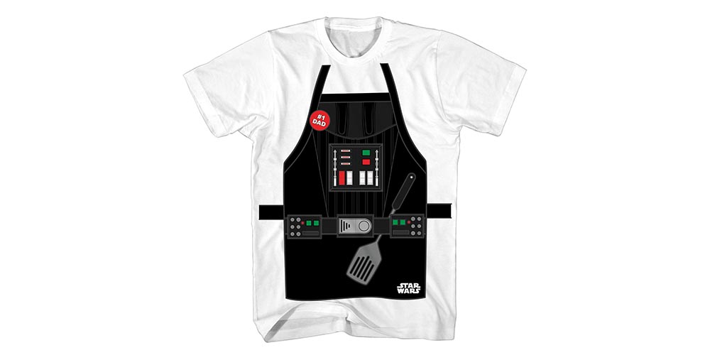 What’s not to love here? Just look at it! Darth Vader preparing to grill up the best steaks and burgers this side of Alderaan? And with a “#1 Dad” button to boot? Yes, please.