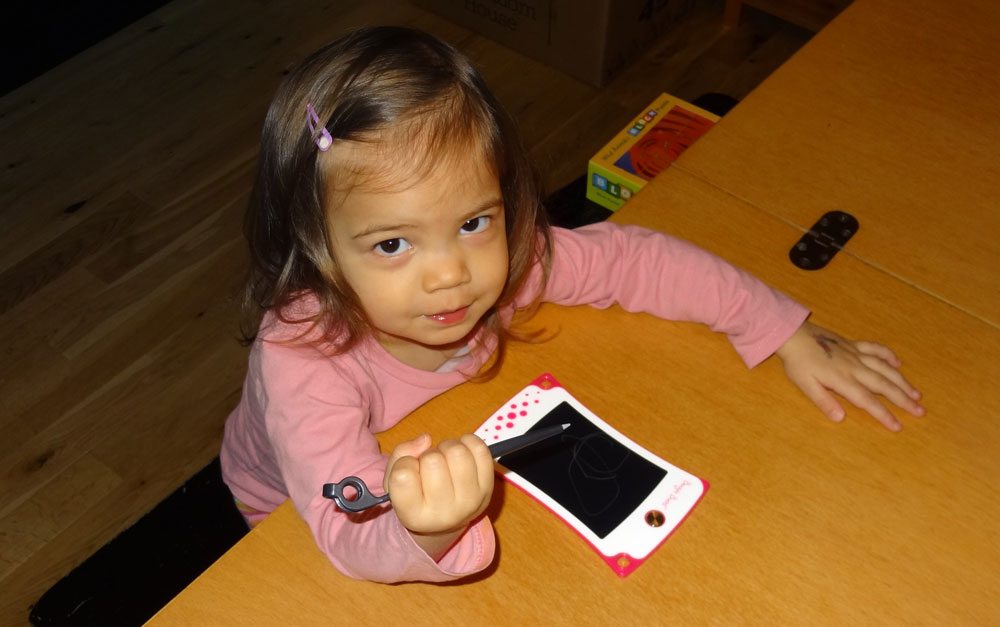 The Jot is pocket-sized (for a large pocket), with a 4.5″ diagonal screen. The stylus clips onto the side, and can also be put through the hole in a corner to stand it up, though I’m not entirely sure how useful that is if you’re planning to write on it. What’s great about this, though, is that my toddler can draw, clear the screen, and draw some more, without needing to get more paper. Both of my older girls loved playing with it, too, and it’s small enough that I can have grab it to have in the car for a short drive.