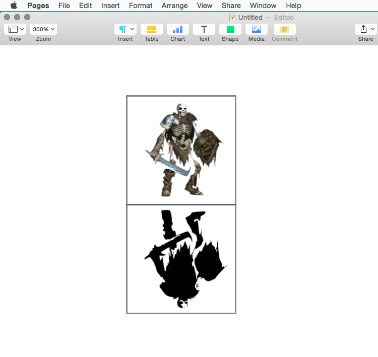For something like skeletons, I usually end up grabbing a bunch of images so there’s some diversity in look, but here I’m just going to show you how to create one particular skeleton miniature. I’m using a Macbook Air, so I either download the image to my computer or use the screen capture tool (Shift-Command-4) to grab it. I make pairs of each image, one will be the front and one will be the back.