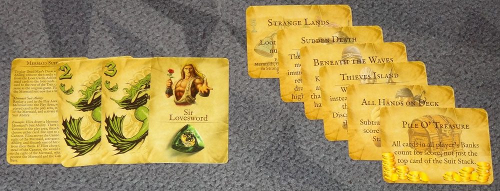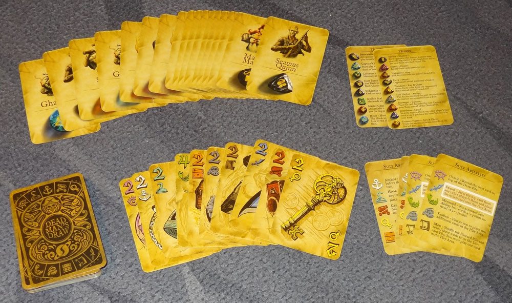 The Trait cards add special powers for the players, and make the game asymmetrical. Most of the powers affect a single suit, either for yourself or for all your opponents, but there are some exceptions too. Mystic lets you reveal three cards instead of one with the Oracle. Fisherman lets you automatically bank Kraken cards when they’re drawn, so they don’t give you a penalty. Misfire forces your opponents to use Cannons against themselves. Like the suit abilities, Trait abilities must be used when possible, even when it is to your own disadvantage.