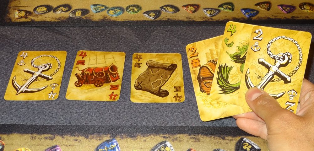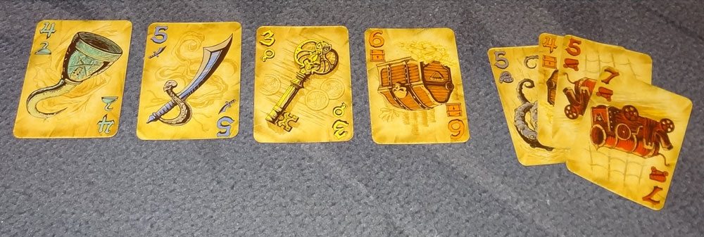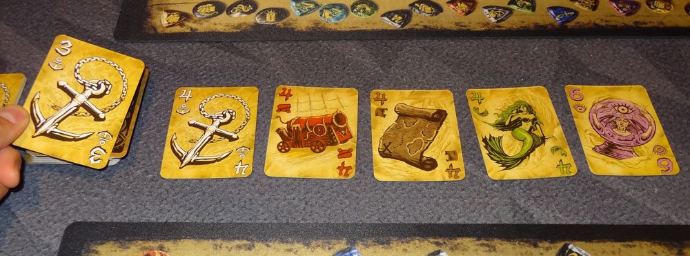 To set up, first pull out the lowest card of each suit to form the discard pile. (Most suits go from 2 to 7, but the Mermaid suit goes from 4 to 9). I sometimes forget this step, but it’s important to have some cards in the discard pile when the game begins.