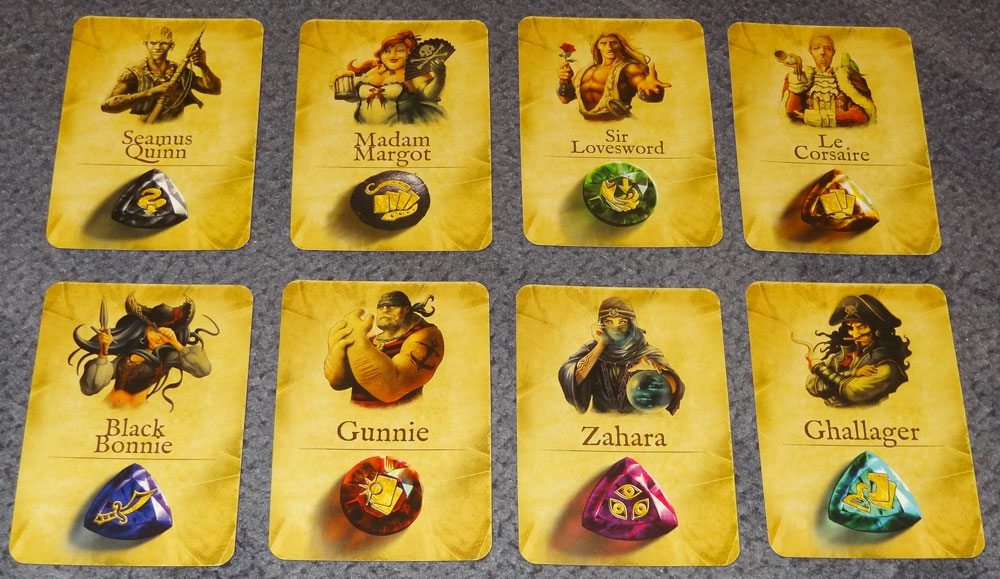 The Loot card graphics are exactly the same as those from the app, with the number and an icon in the top left and bottom right corners of the cards, and a large illustration in the center. The Trait cards feature a pirate portrait at top, the pirate’s name in the center, and a gemstone representing the power below.