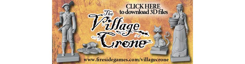 Don’t fret. Fireside Games has both sides covered — and in a way that is amazingly innovative. Rather than suffer the cost of creating a bunch of molds and having figures made (and you and I having to pay more for a game that has a lot of plastic), Fireside Games has ingeniously packed their game with cardboard standees, so it can be played right away. But if you’re someone who has to have minis, there’s an option for you, too. On The Village Crone page, there is a link to files that you can download (at absolutely no charge) for sculpts of all the figures and tokens in the game. Download the file and then you’re free to print your own minis at home (or library or local maker space) using a 3D printer. It’s a brilliant solution and one I expect we’ll see from other publishers soon. I’ve never seen this in a mass market game and I absolutely love the idea.