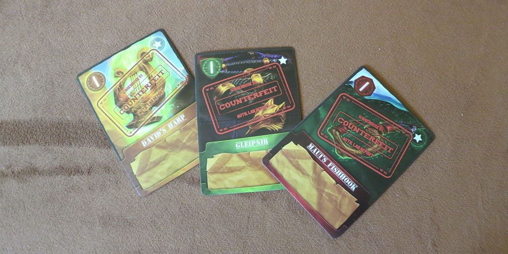 Play continues until all of the Relics are purchased, and then chaos really sets in. Prior to scoring, players can buy back the aforementioned pawned Relics. If a player has one of two cards that grant Certificates of Authenticity, she can play that token on a Relic that she believes might be Counterfeit, making it legitimate. The Counterfeit cards that have been placed on the table are revealed and compared to cards in each player’s collection. Any Counterfeits that aren’t protected by Certificates of Authenticity are immediately discarded and any effect that Relic granted is lost. Other effects are resolved and scoring begins as described, above.