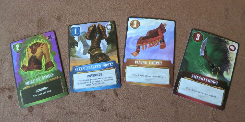 For example, here’s one scenario we ran into when playing: in a close race, a player (who may or may not be my son) thought he had enough blue cards to qualify for the highest value of Western fantasy and literature Relics, only to find that one of his highest valued Relics was nullified by a Counterfeit card he wasn’t privy to (which explained the snickering coming from the other side of the table when he bought it). Further pain was caused because he had the (blue, value 2) Malleus Maleficarum Relic, which states “If you do not end up scoring for 1st or 2nd place in this category, you lose 3 points.” Next thing he knew, he wasn’t in first. Instead, he was in third place and went from an 8 point gain to -3 points.