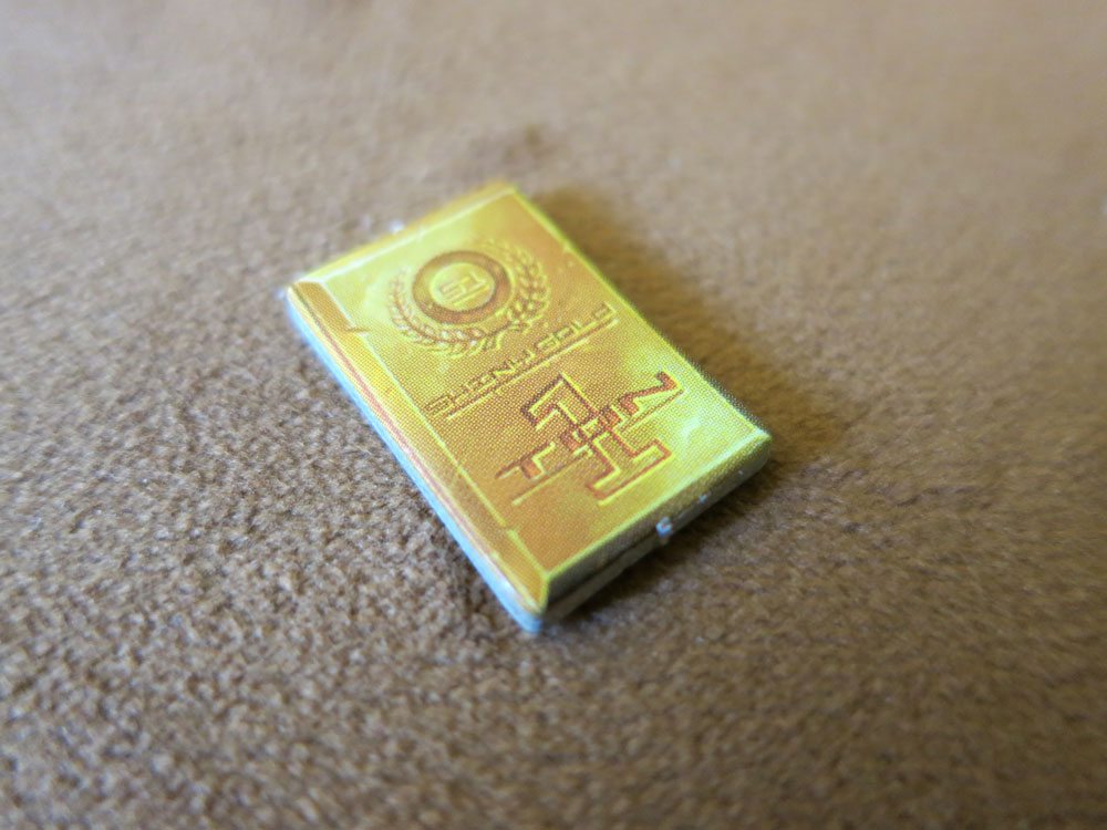 In the box are 26 Relic cards and 23 Counterfeit cards, both backs are designed to look like crates, building on the warehouse theme. Additionally, there are 72 gold ingot tokens (worth one billion dollars each, natch) because what else would world powers use to buy the world’s most valuable treasures? Finally, there are a handful of tokens for pawning items and certifying authenticity–more on those in a bit–and a rulebook.