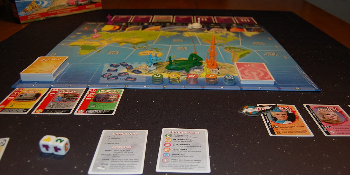 At a glance: In Thunderbirds, you take on the role of one of the members of International Rescue. Working together with the other players, you travel around the world rescuing people and averting disasters while trying to collect enough materials and bonus tokens to avert three schemes plotted by the nefarious villain Hood. If your team can defeat Hood’s schemes before he enacts them, you win, but if he manages to pull even one of them off, or if you fail to avert any of the disasters before they make their way down the disaster track, you lose.