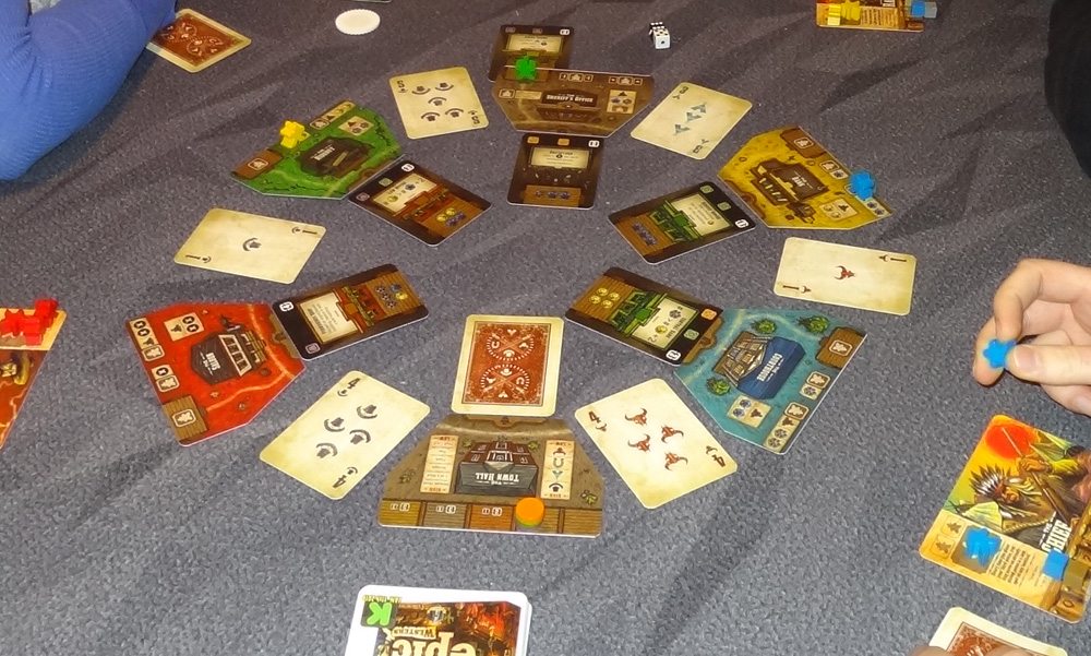 Then, deal poker cards: deal one face-up card between every pair of locations. Then deal one face-down poker card below the Town Hall card–this is the Rival card. Finally, give each player 2 poker cards. Each player chooses a card to keep and discards the other face-down.