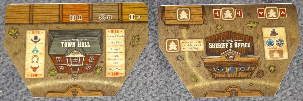 The Location Boards (plus the Town Hall and Sheriff’s Office) have various spaces marked with a meeple for placing your Posse Members. the boards are cut so that they can be arranged in a ring, with cards in between the locations. Each location also has an illustration of the building, and a reward for winning the poker hand at that location (marked with a pile of chips).