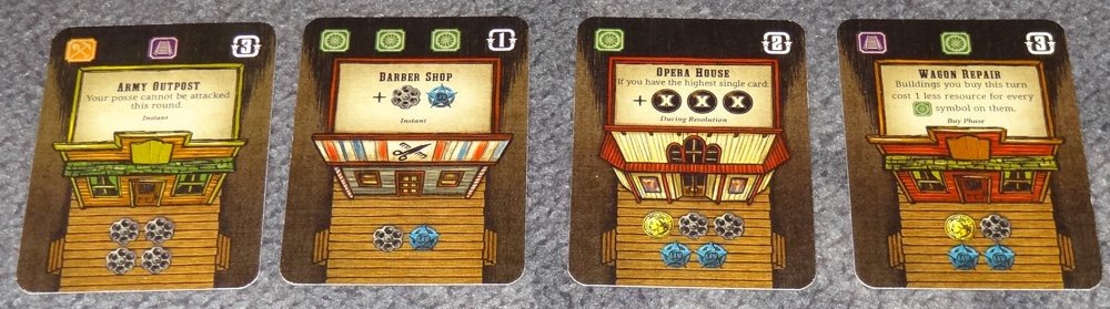 In poker hand order, players may each buy one building. You may only buy a building if you have a Posse Member at that location (even if it’s wounded). Pay the resources shown on the card, and then place that building on the porch on your Location board, splaying out any previous buildings so the industry icons are visible. If you do not buy a building, you may stand up your third Posse Member for use during the next round. Finally, if any player took the “buy second building” point on the Sheriff’s Office, they get a chance to purchase a second building from anything that’s left.